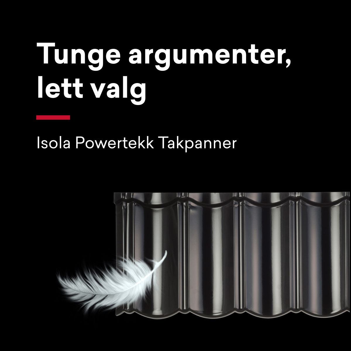 I et byggeprosjekt så er det mange valg og beslutninger som skal taes. Alle søker alltid etter en bekreftelse på at man har tatt det riktige valget, det er derfor man googler, leser side opp og side ned, spør om råd osv. før man skal ta et valg. Det er en rekke veldig gode argumenter for å velge Isola Powertekk takpanner som f.eks. at det ser fint ut, er stormsikkert, tåler høy vekt - gode argumenter som vi ønsker å få frem. Hvis man kan huke av "ja" på en eller flere av disse, blir det til slutt et lett valg, noe som passer egenskapen som går på vekt veldig godt.